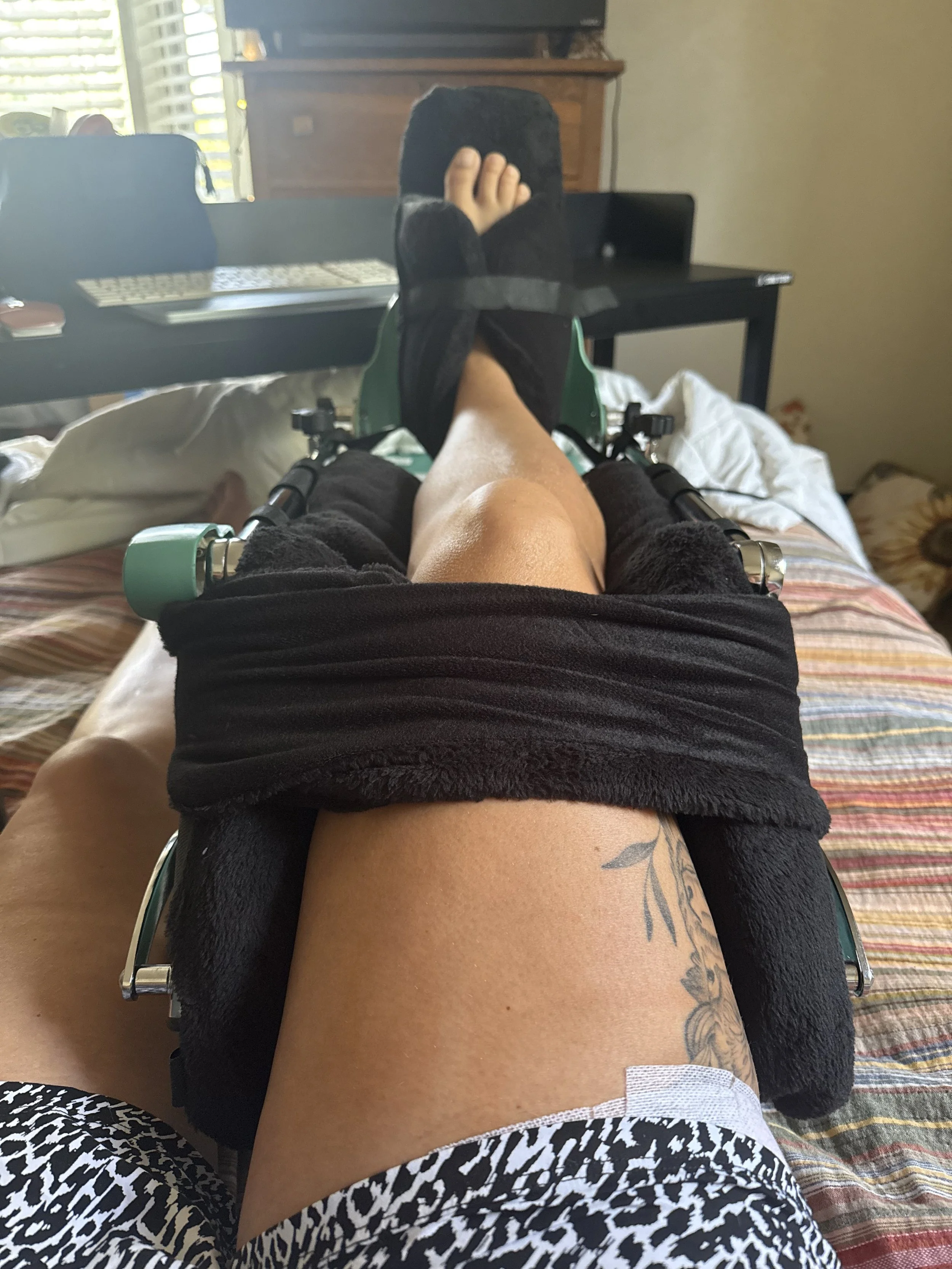 I had a Continuous Passive Motion (CPM) machine dropped off for post-surgery range of motion support and was told to use the machine 6-8 hours/day! It is huge and very heavy so we decided to prop it up next to my bed so my mom can easily put it in and out when needed.